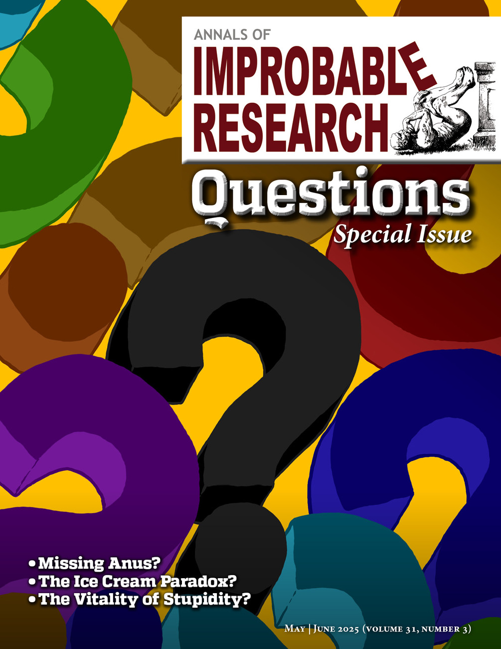 AIR Vol 31, Issue 3$8$8https://schema.org/InStockusdImprobable Research™Improbable Research™Special Issue: QuestionsTopics in this issue include: Missing Anus? The Ice Cream Paradox? The Vitality of Stupidity? Add to cartPages36Add to wishlist New wishlistShare on XShare on Facebook Copy linkCopy product URL